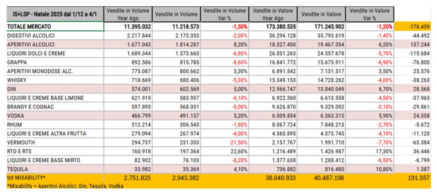 Le vendite di spirits e aperitivi alcolici nel settore horeca hanno mostrato una leggera flessione nell’anno terminante a novembre 2025, pari a -1,4% a volume e -1,8% a valore. Questo calo, peraltro contenuto, si spiega anche con uno spostamento di volumi dal canale fuori casa a quello domestico.